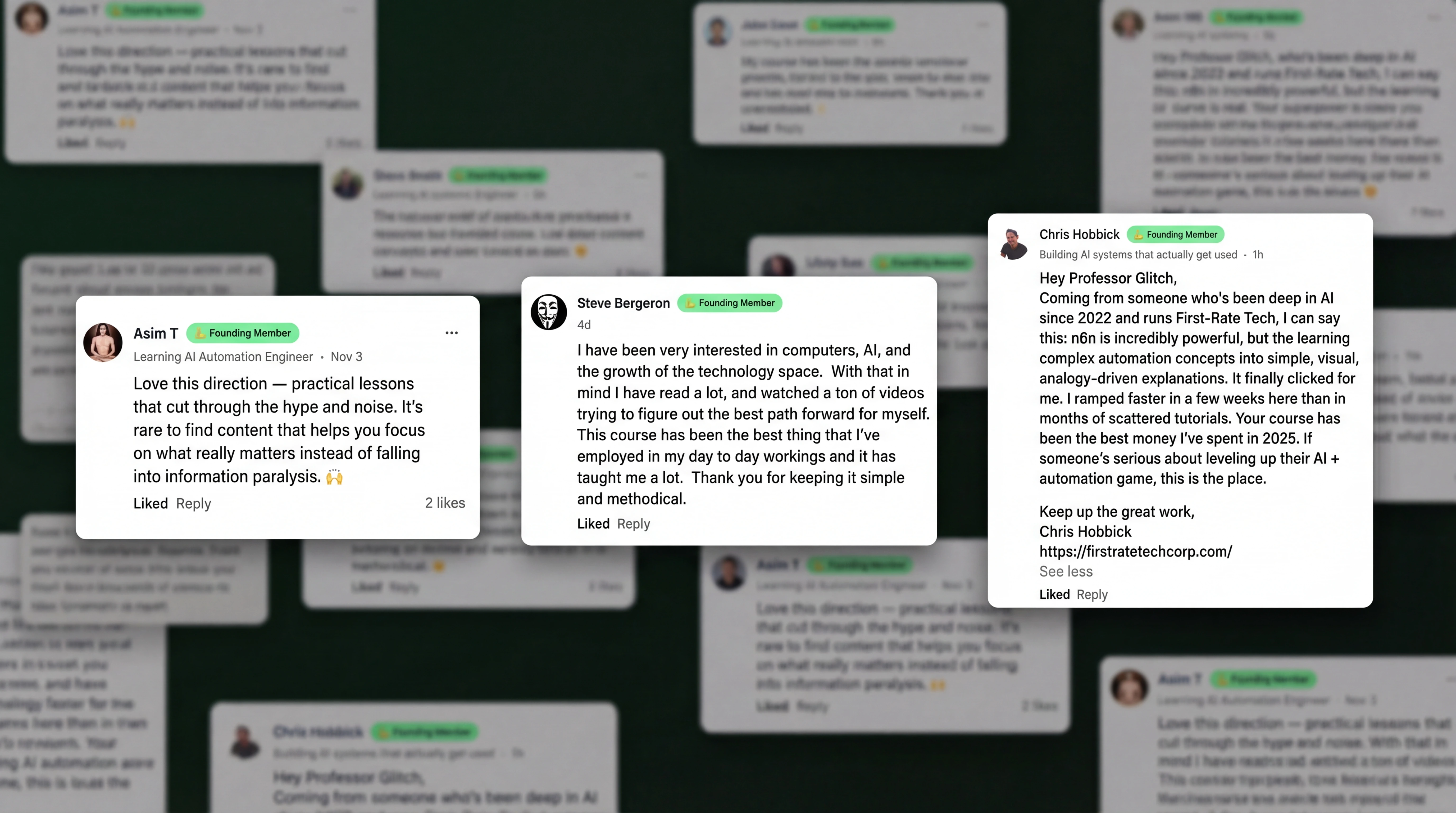 "Your superpower is how you break complex automation concepts into simple, visual, analogy-driven explanations. It finally clicked for me. I ramped faster in a few weeks here than in months of scattered tutorials. Your course has been the best money I've spent in 2025."